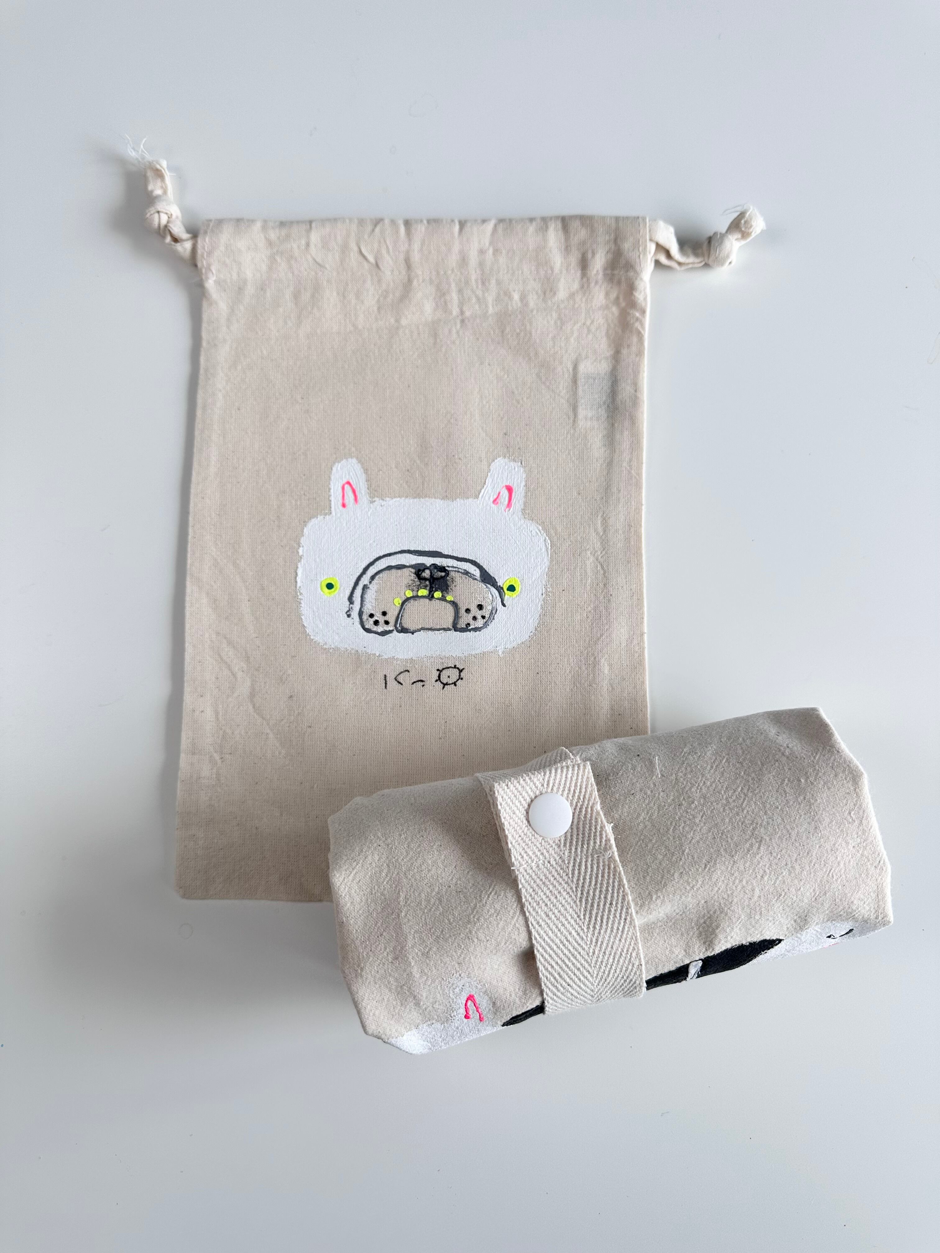 手描きのイラストが可愛いマルシェバッグSETです。巾着とマルシェバッグの2種類がセットになっているので、使い分けも出来ます。大きめのマルシェバッグは肩がけもでき、持ち手を結んで持ってもかわいい形です。くるくるまるめてスナップボタンでとめれば巾着に収納もできます。旅行やお買い物、アウトドアなど、様々な場面で活躍してくれます。