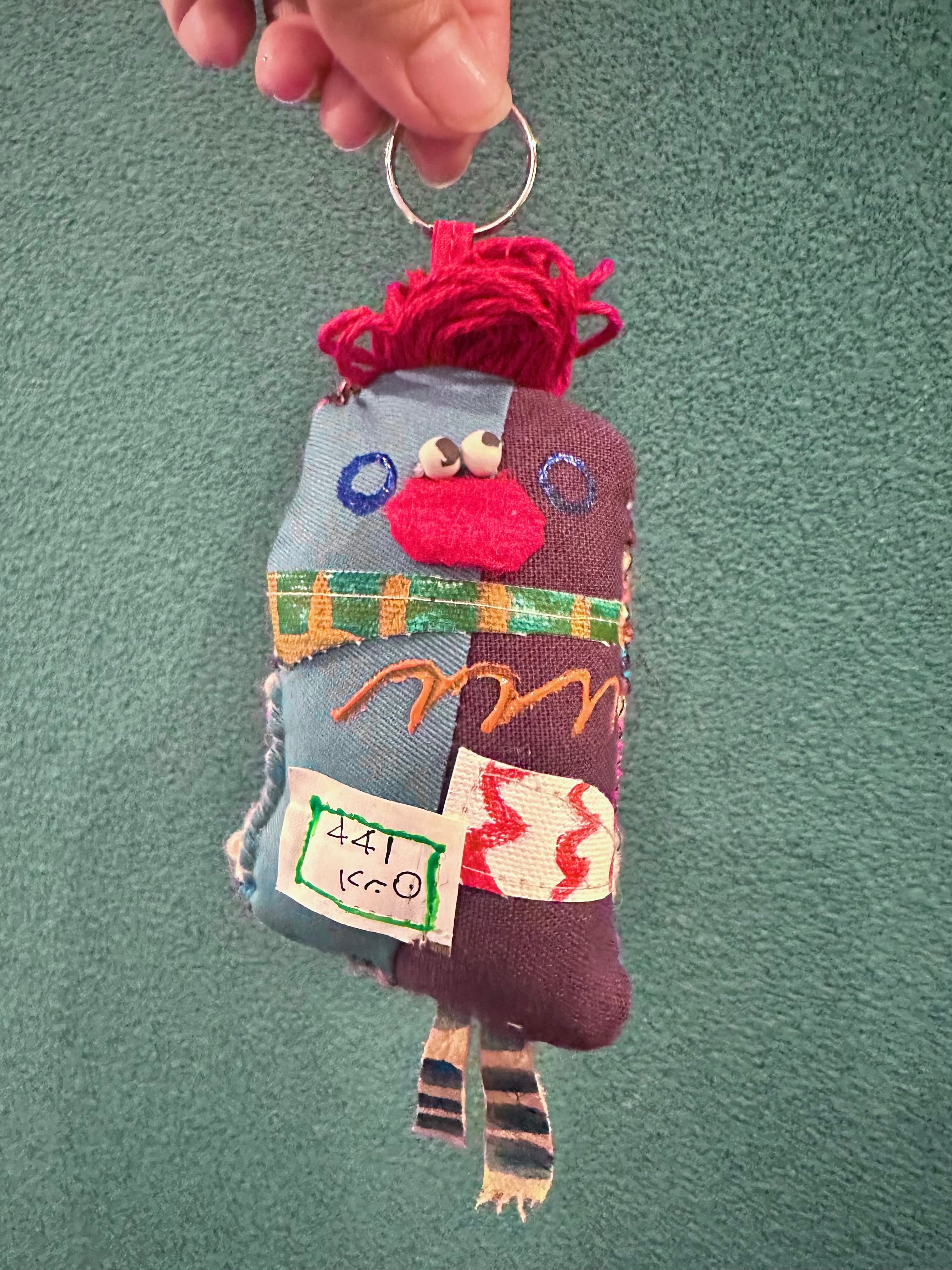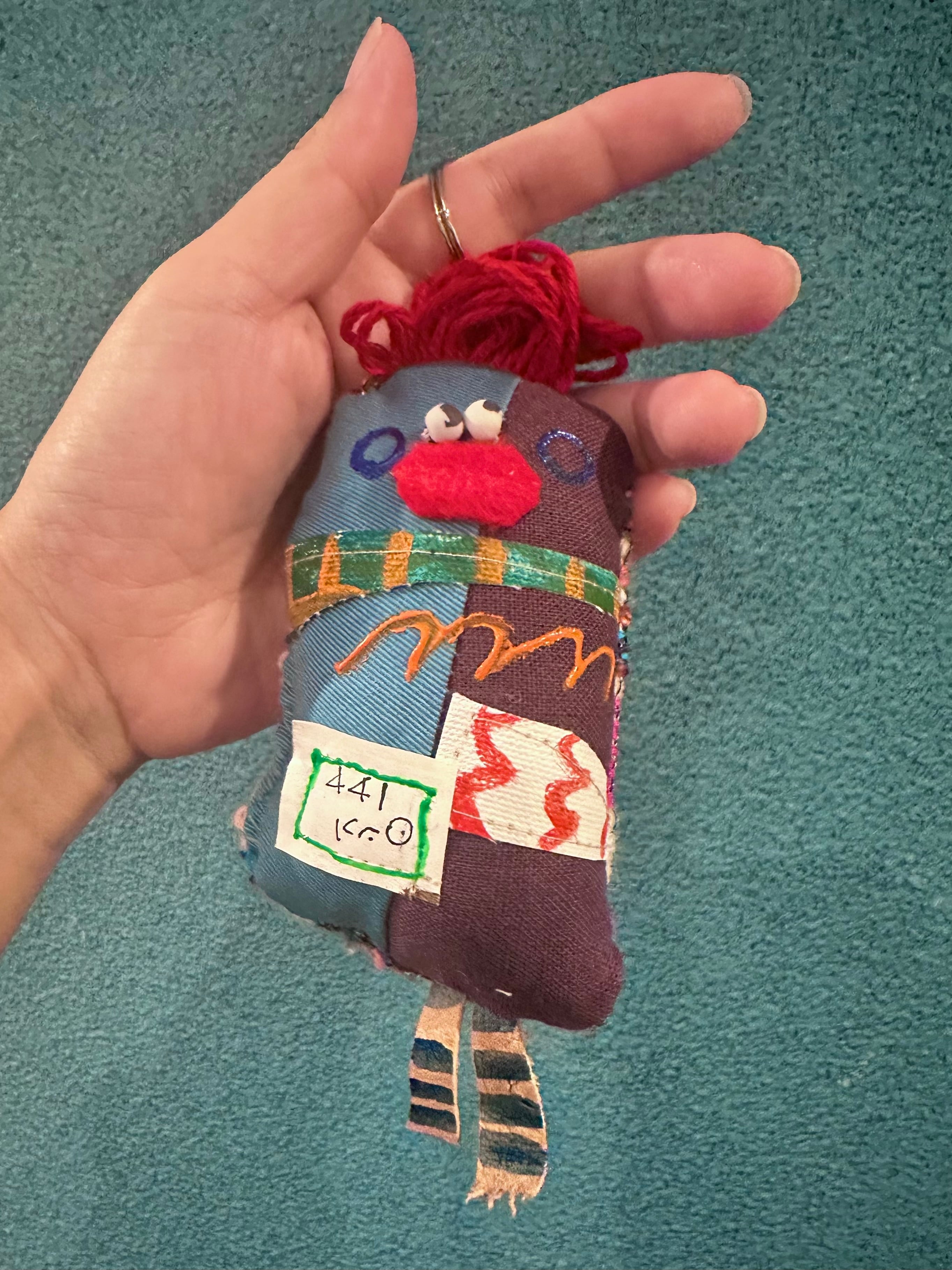 ぬいぐるみ制作が終わると、〆作品として作るハギレンジャー。作品制作時に生まれたハギレや端材と手織りされたさをり織のハギレ、古着を再利用した、小さなマスコット。目玉に使っているのは陶芸家さんに作っていただいた陶ビーズで愛嬌あるマスコットです。頭のてっぺんに二重リングをつけてあるので、キーホルダーやバッグチャームなどにも使用できます。制作した順番にシリアルNo.をつけています。