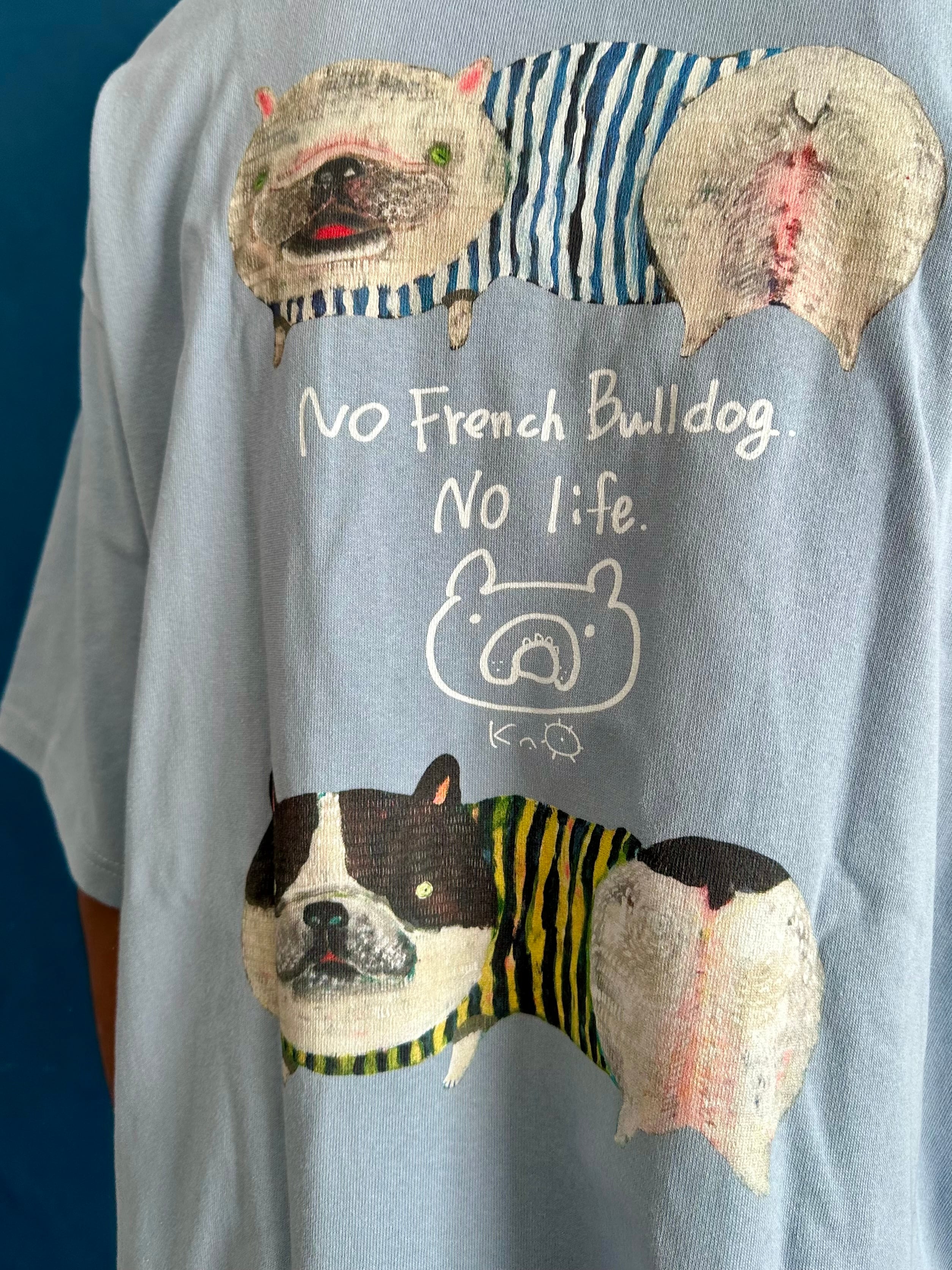 シャリ感のあるヘビーな生地にトレンドのビッグシルエット。そしてにいつかに描いたフレンチブルドッグ(クリーム柄とパイド柄)をBackプリントしました。