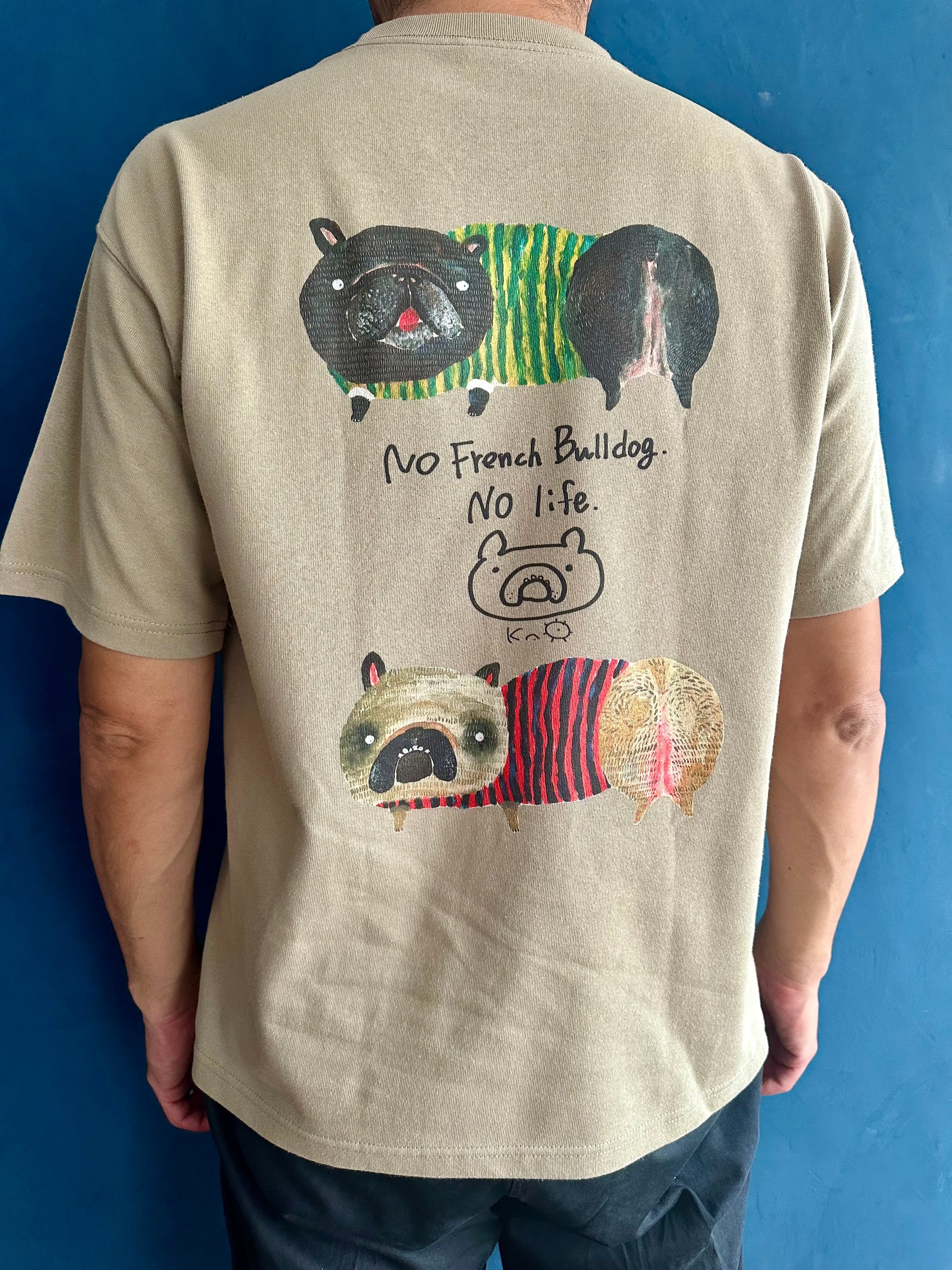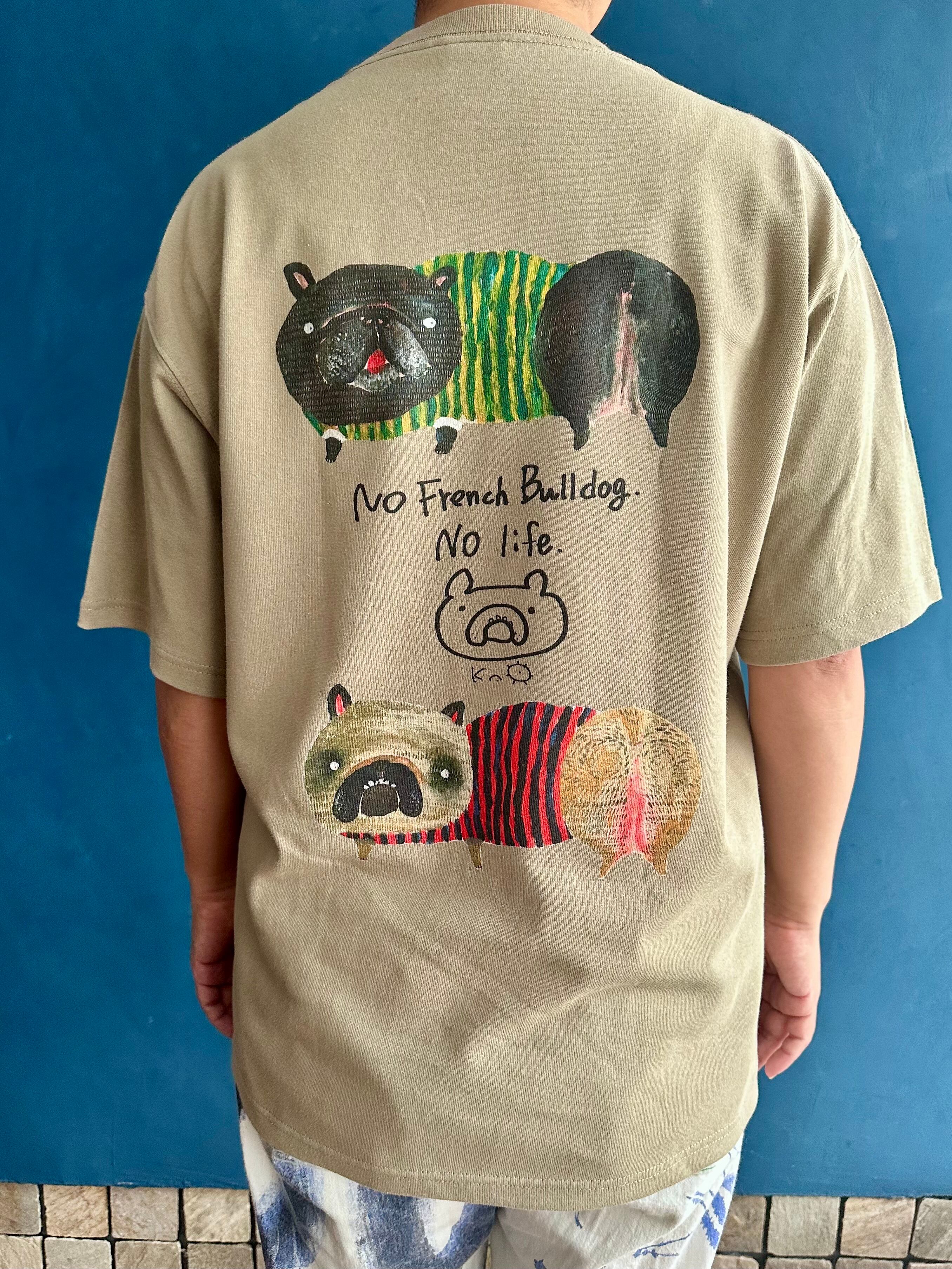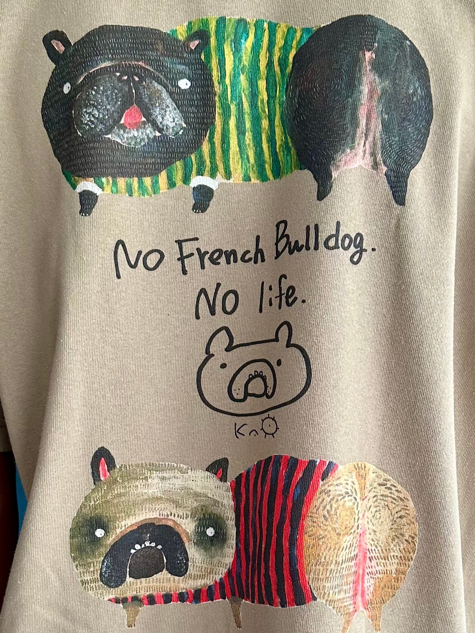 シャリ感のあるヘビーな生地にトレンドのビッグシルエット。そしてにいつかに描いたフレンチブルドッグ(ブリンドル柄とフォーン柄)をBackプリントしました。