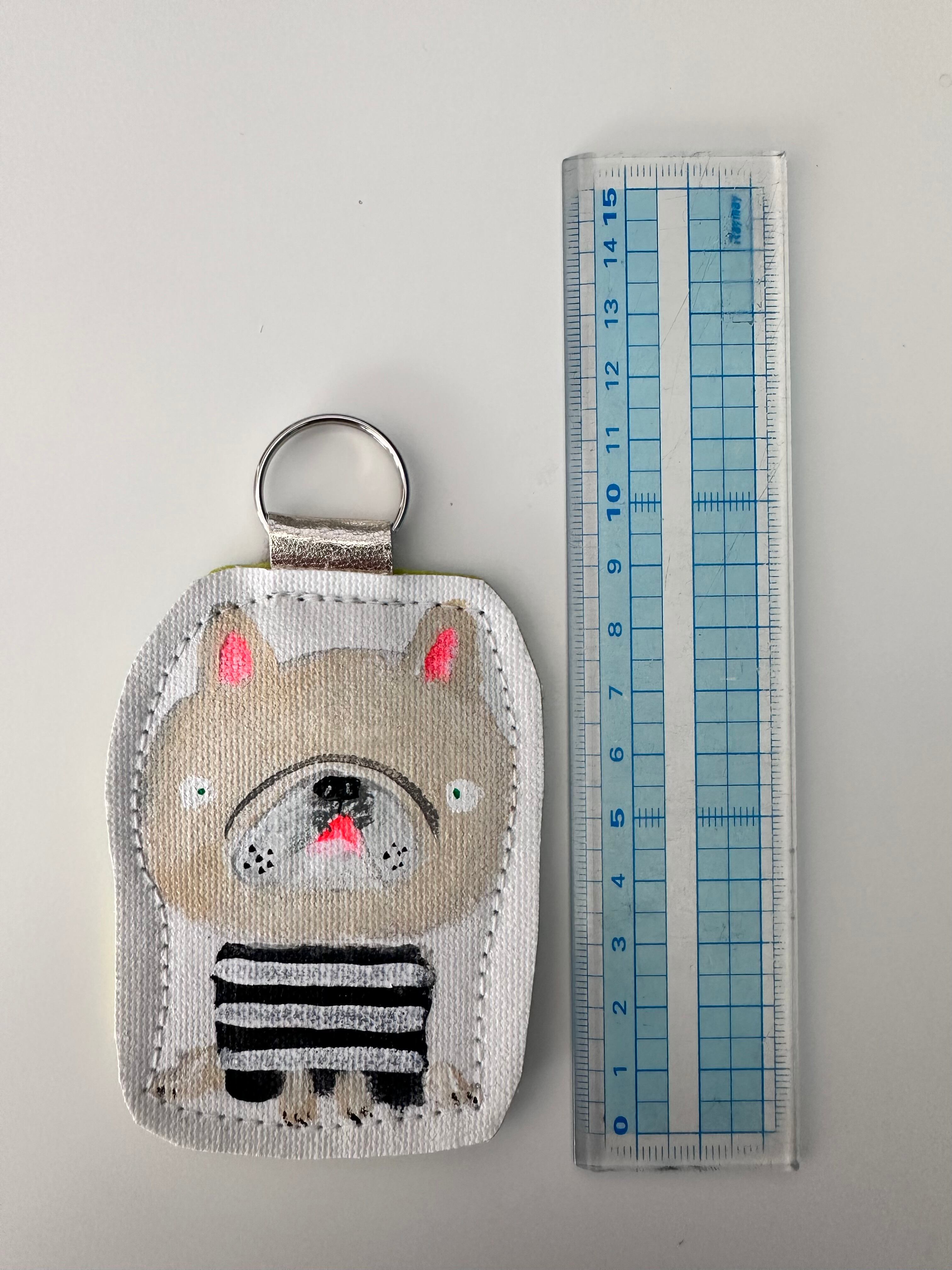 canvasの端材ができると制作するのが小さな小さな日用絵画雑貨たち。こちらはcanvas端材と革端材で作るキーホルダー。裏面は制作年月日入り