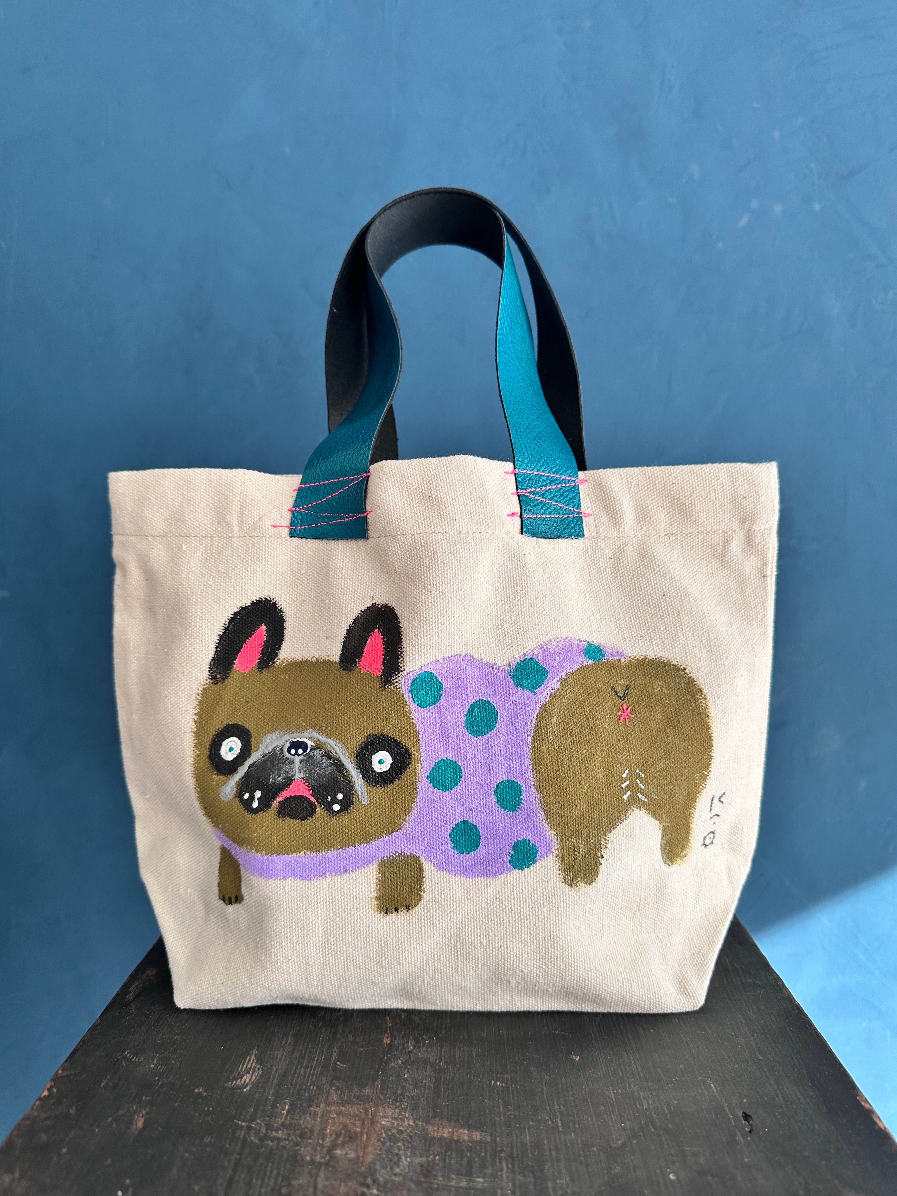 帆布生地に手描きペイントした小ぶりのトートバッグ。
