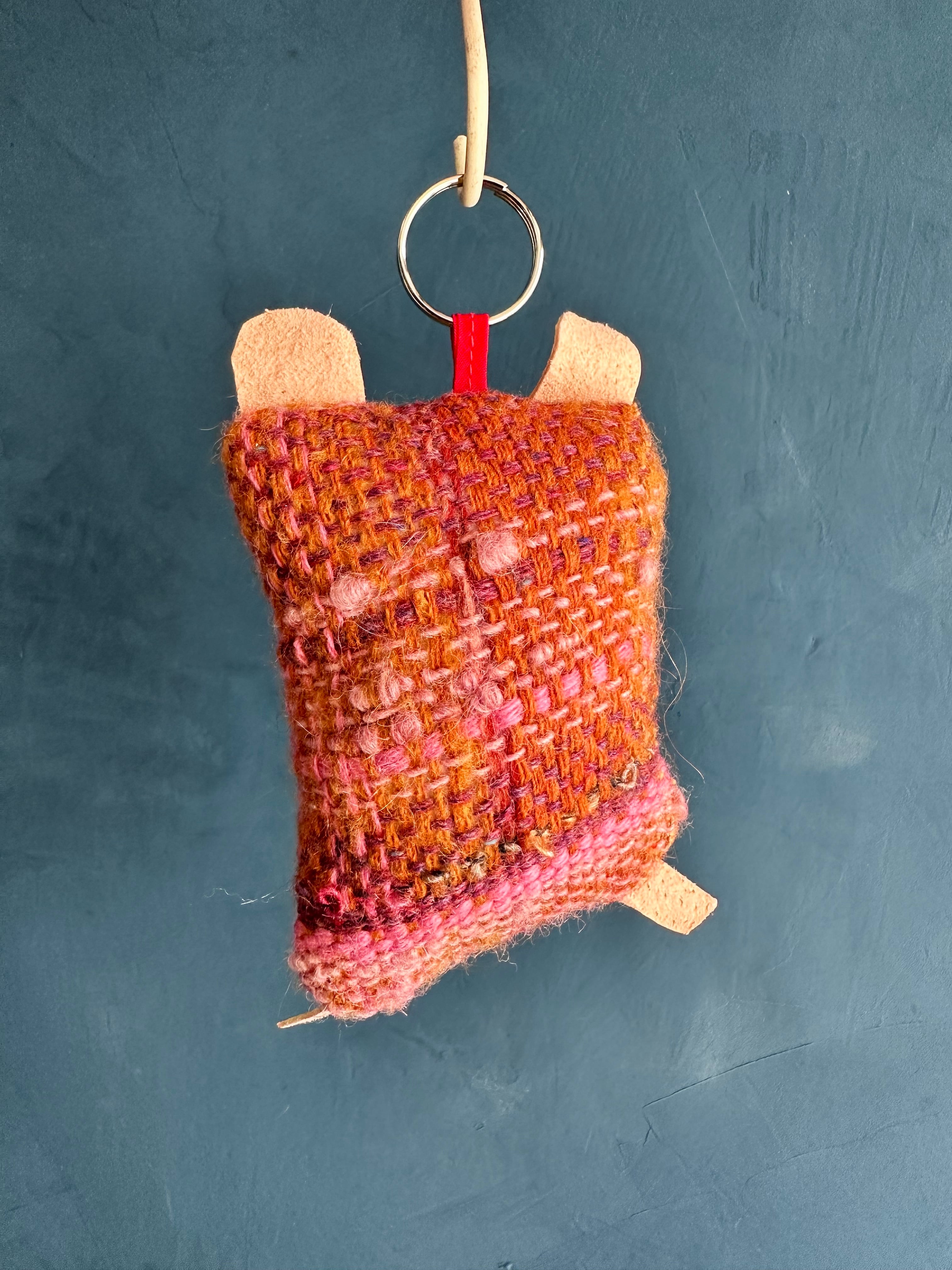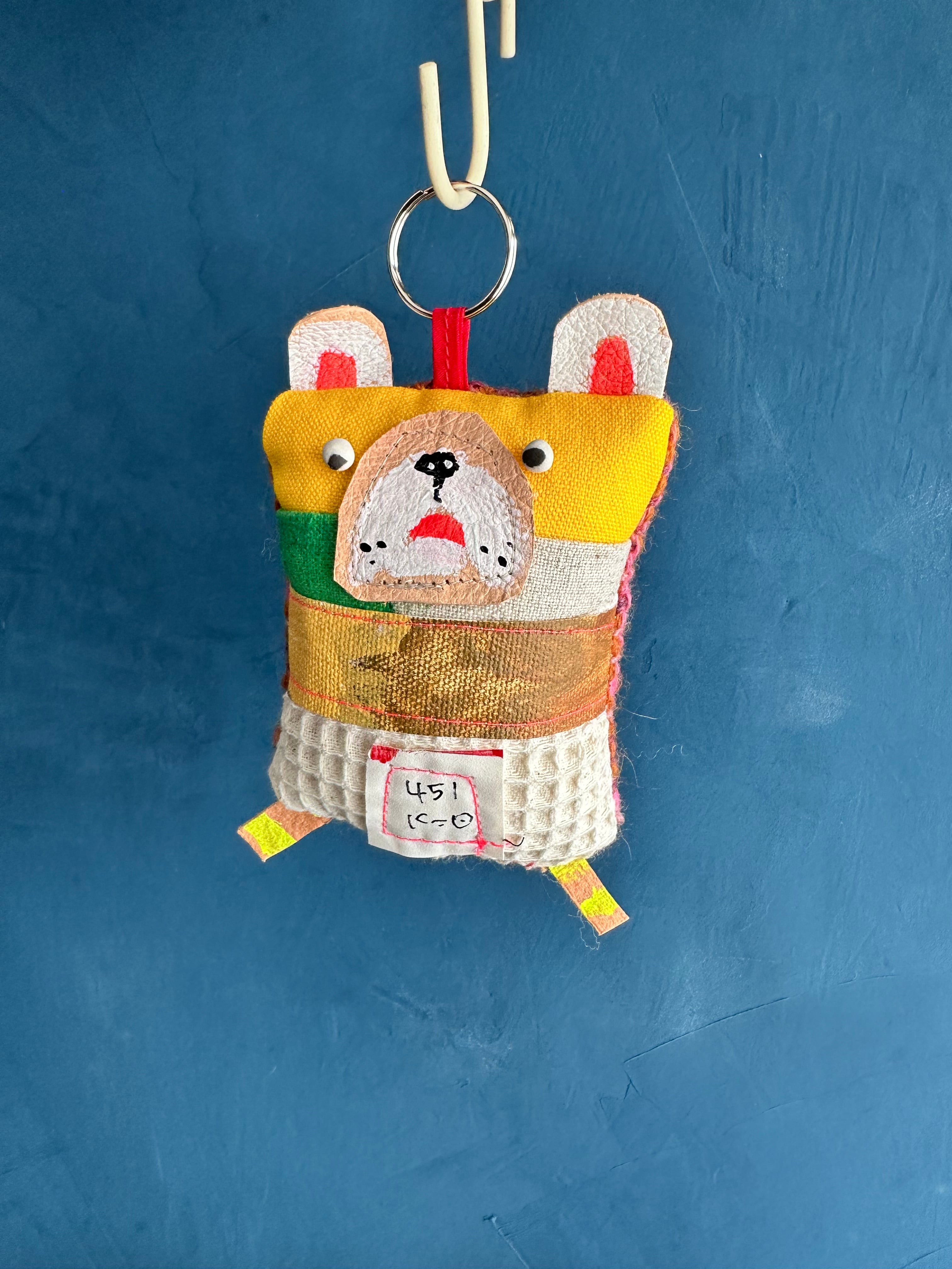 ぬいぐるみ制作が終わると、〆作品として作るハギレンジャー。作品制作時に生まれたハギレや端材と手織りされたさをり織のハギレ、古着を再利用した、小さなマスコット。目玉に使っているのは陶芸家さんに作っていただいた陶ビーズで愛嬌あるマスコットです。頭のてっぺんに二重リングをつけてあるので、キーホルダーやバッグチャームなどにも使用できます。制作した順番にシリアルNo.をつけています。