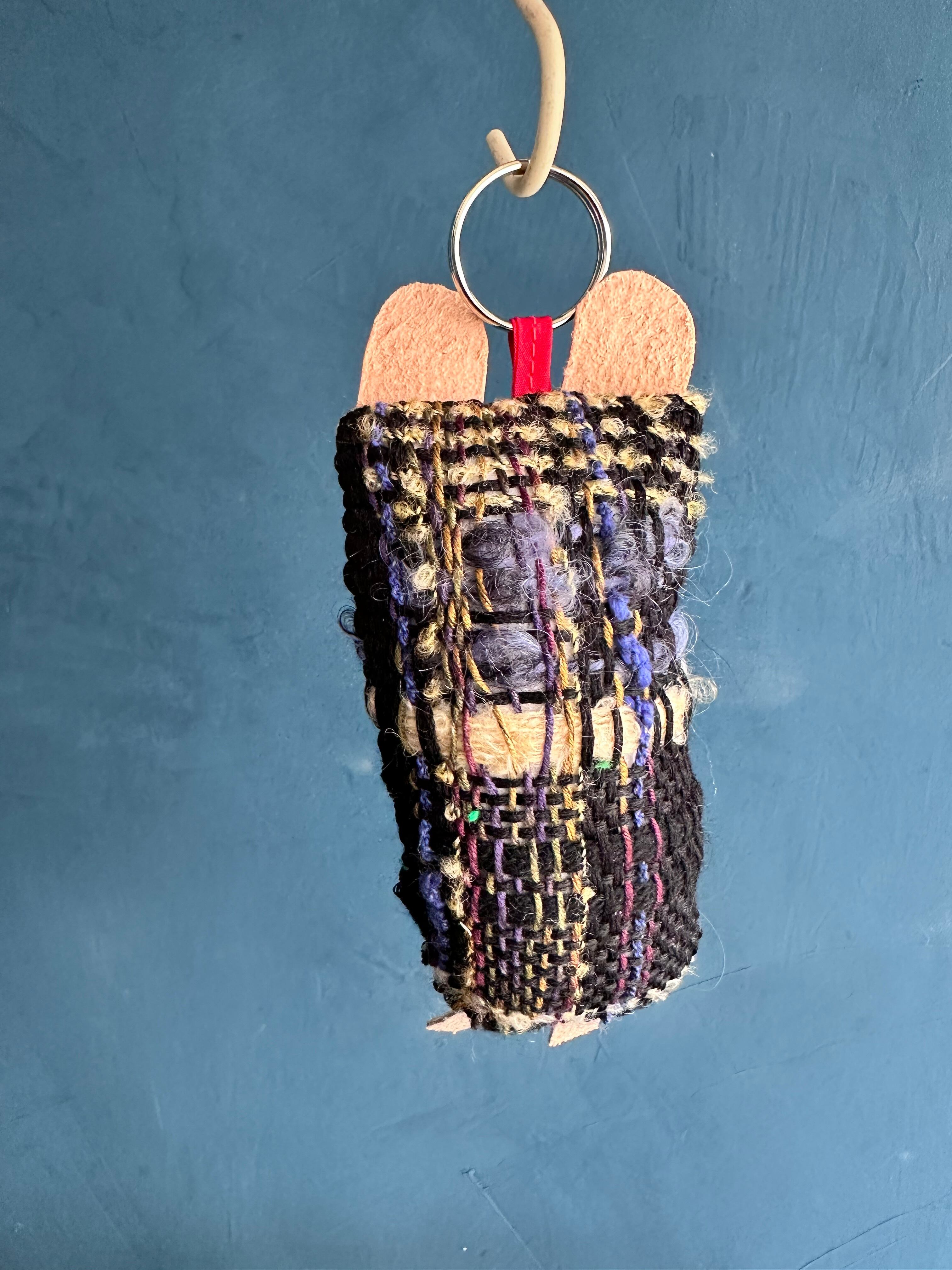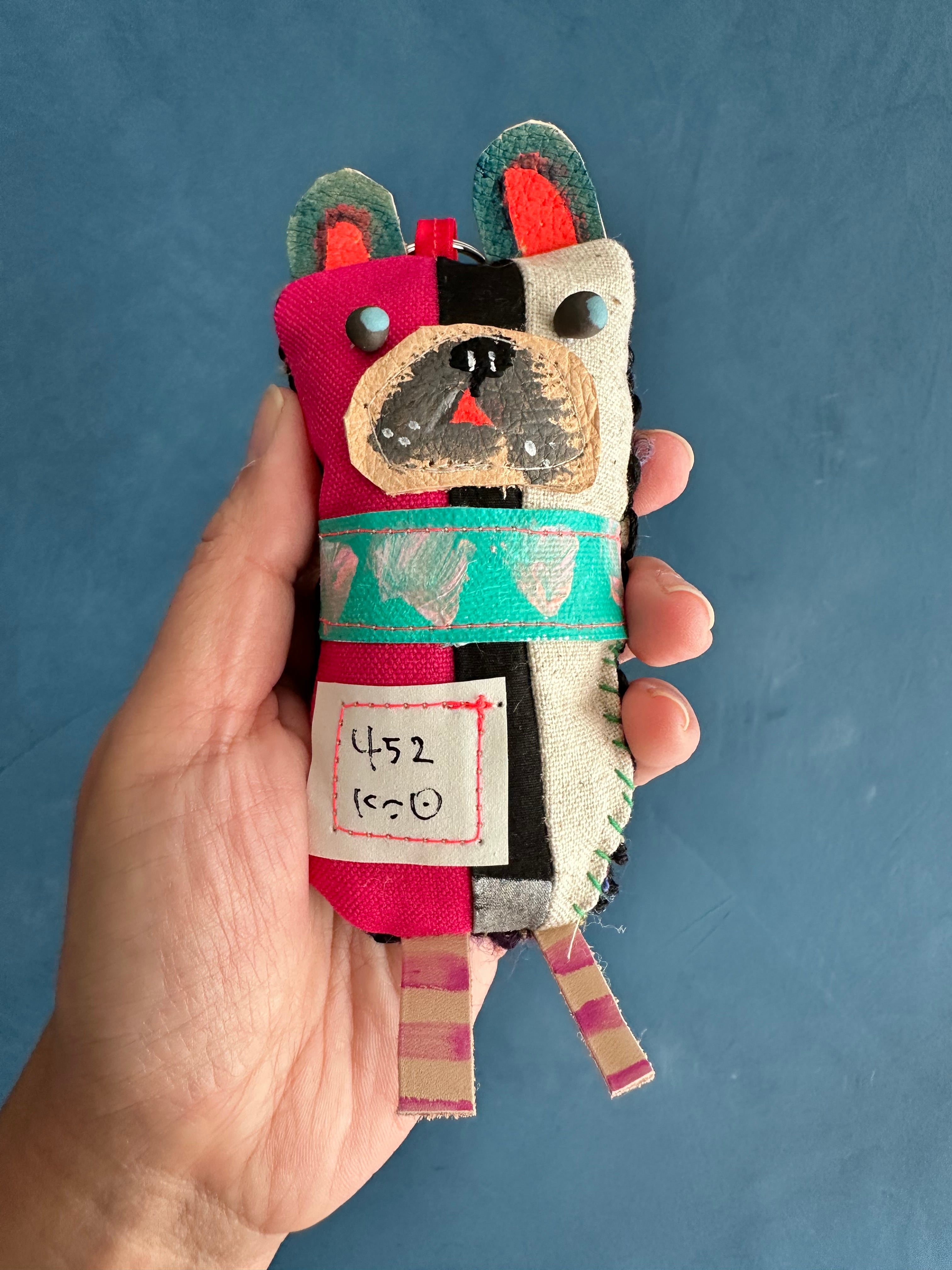 ぬいぐるみ制作が終わると、〆作品として作るハギレンジャー。作品制作時に生まれたハギレや端材と手織りされたさをり織のハギレ、古着を再利用した、小さなマスコット。目玉に使っているのは陶芸家さんに作っていただいた陶ビーズで愛嬌あるマスコットです。頭のてっぺんに二重リングをつけてあるので、キーホルダーやバッグチャームなどにも使用できます。制作した順番にシリアルNo.をつけています。