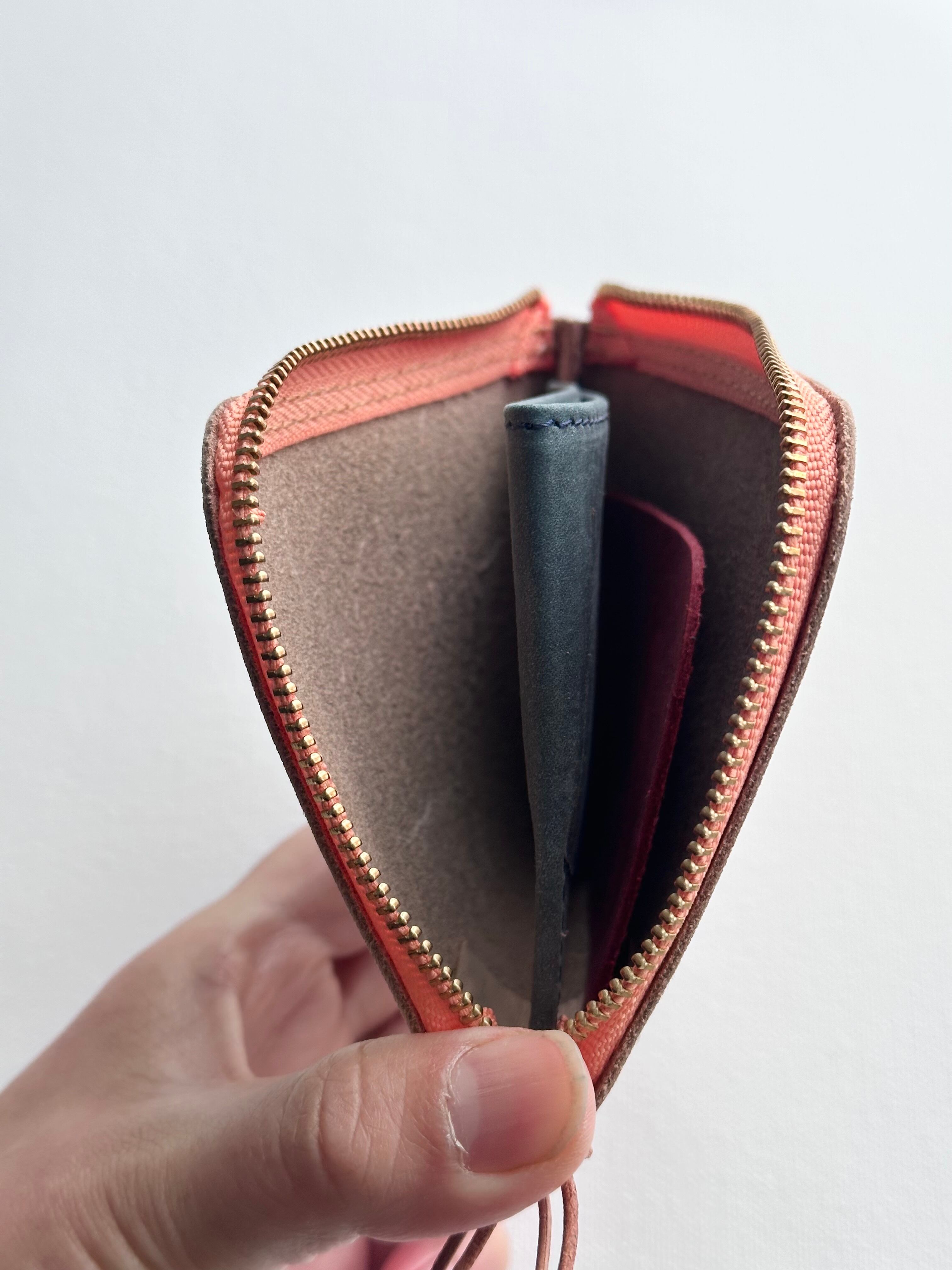 内は豚革もしくは牛革の端材を使用した簡易的な小銭入れと仕切りがあります。