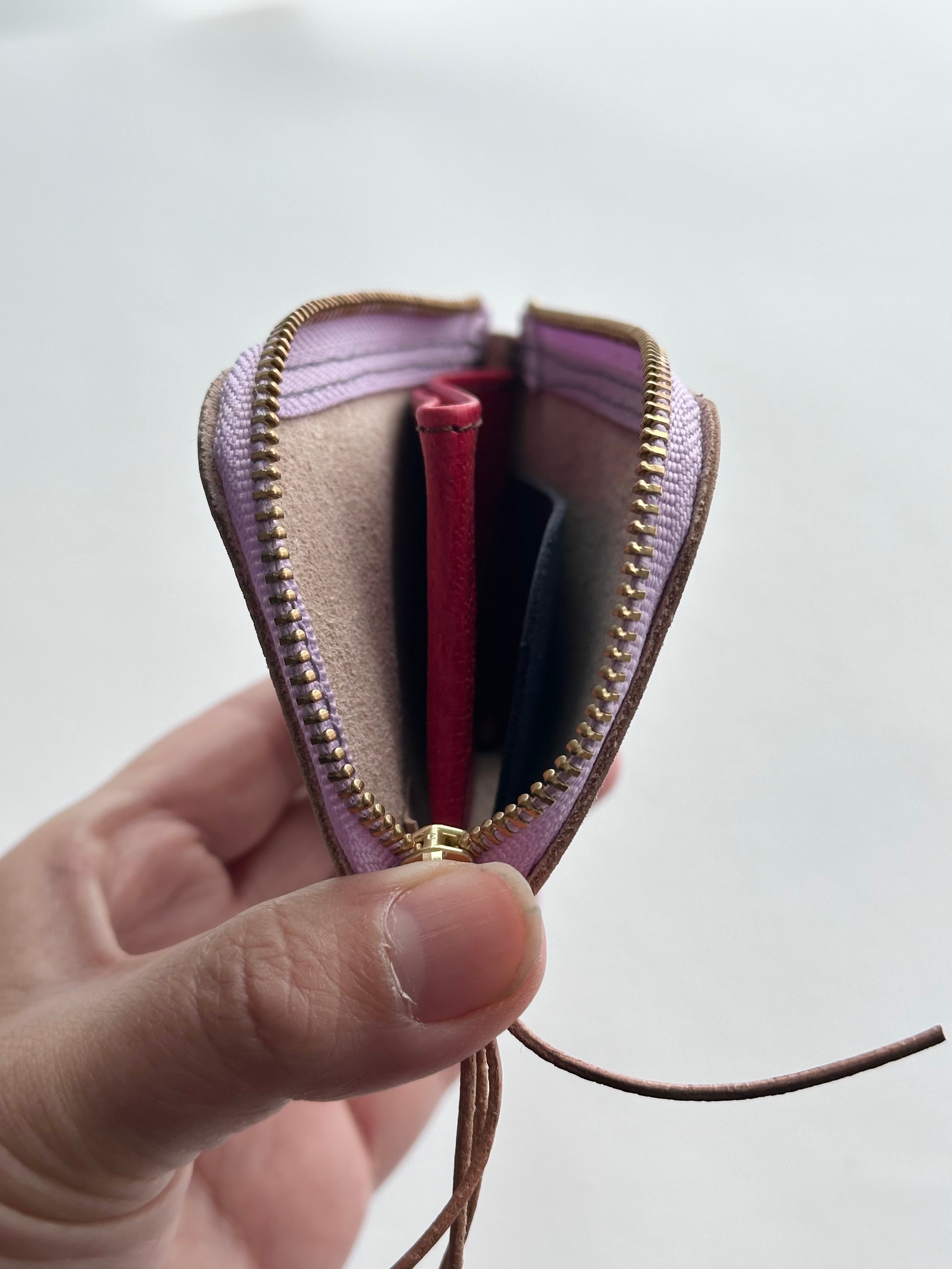 内は豚革もしくは牛革の端材を使用した簡易的な小銭入れと仕切りがあります。