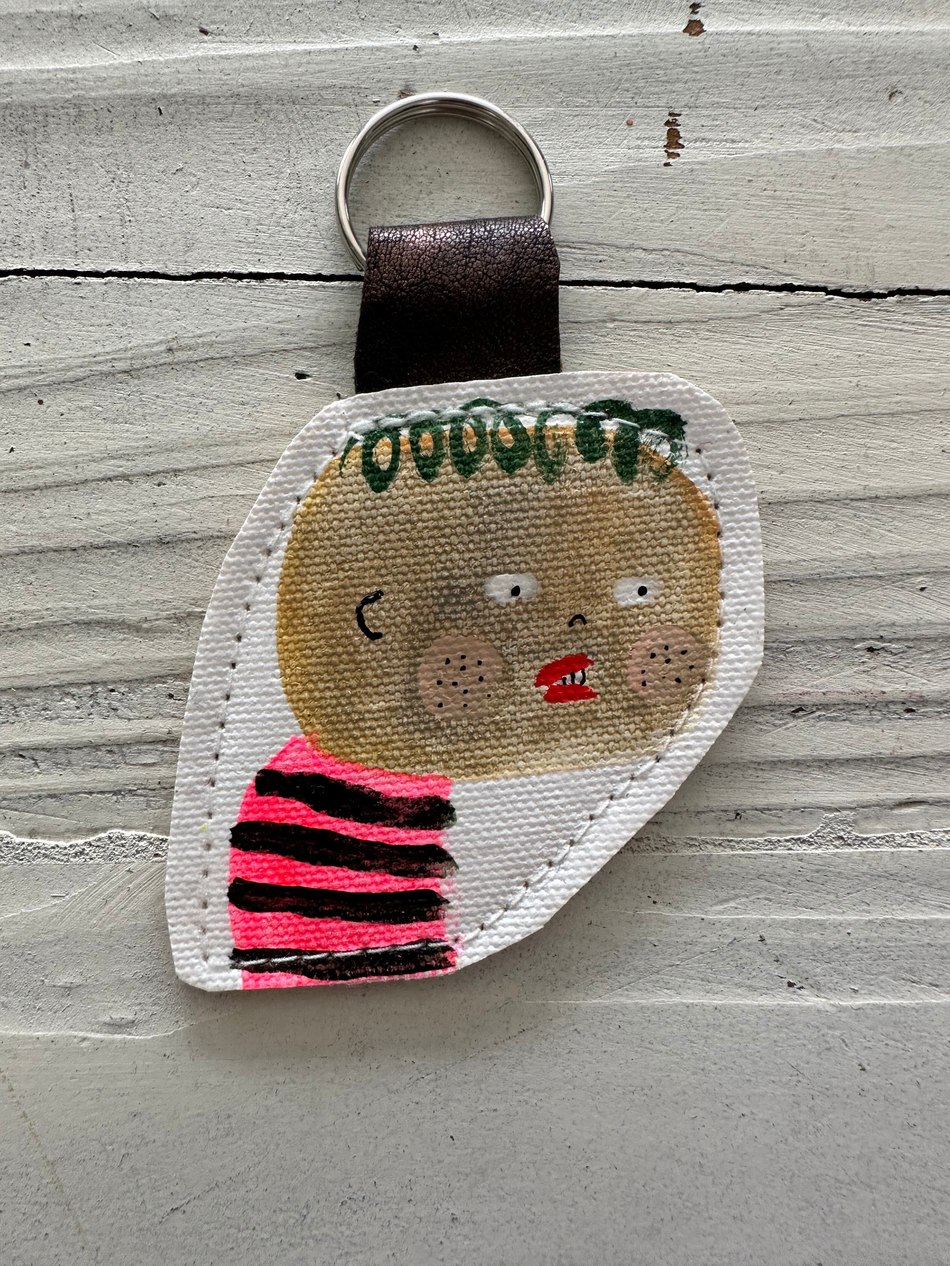 canvasの端材ができると制作するのが小さな小さな日用絵画雑貨たち。こちらはcanvas端材と革端材で作るキーホルダー。裏面は制作年月日入り