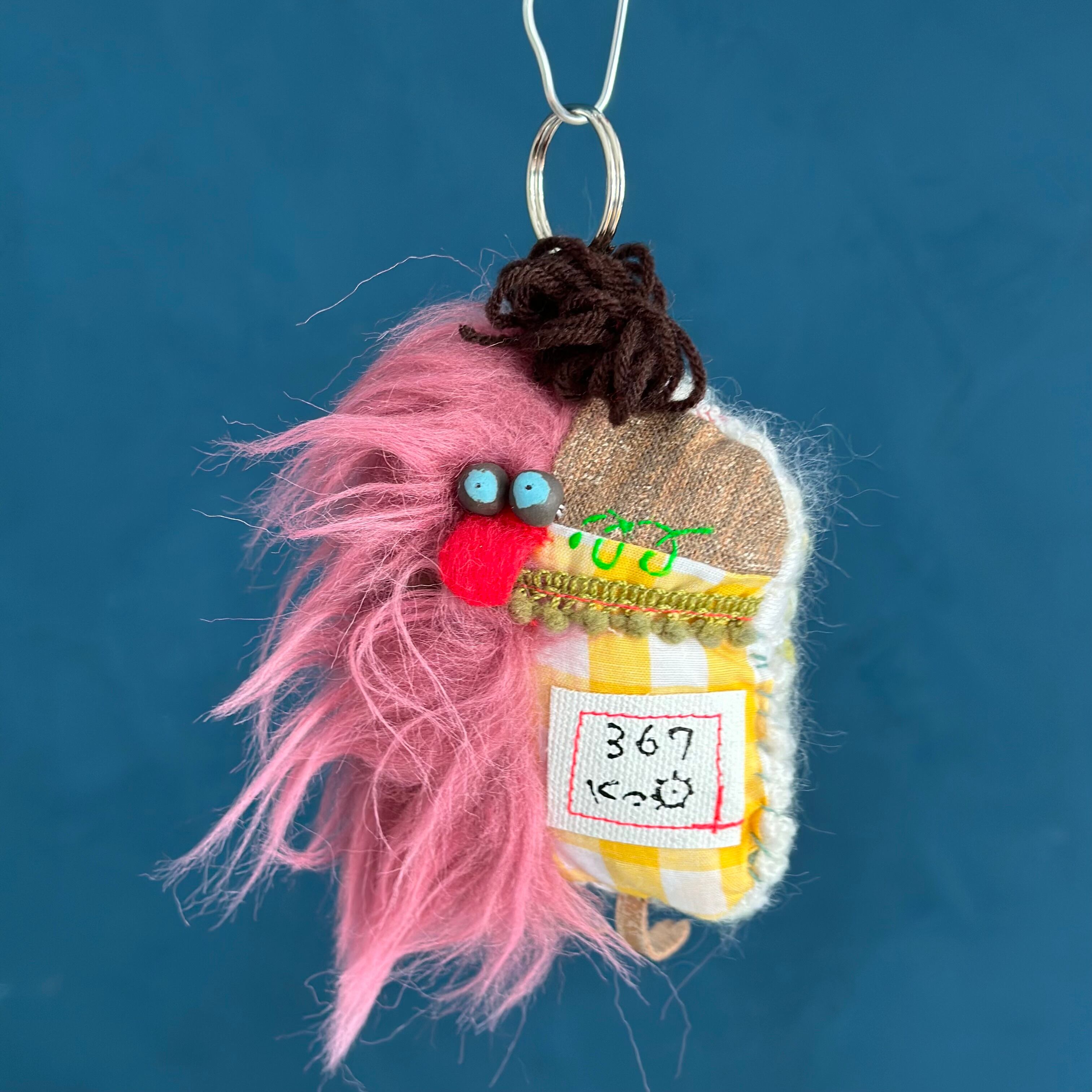 ぬいぐるみ制作が終わると、〆作品として作るハギレンジャー。作品制作時に生まれたハギレや端材と手織りされたさをり織のハギレ、古着を再利用した、小さなマスコット。目玉に使っているのは陶芸家さんに作っていただいた陶ビーズで愛嬌あるマスコットです。頭のてっぺんに二重リングをつけてあるので、キーホルダーやバッグチャームなどにも使用できます。制作した順番にシリアルNo.をつけています。