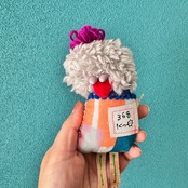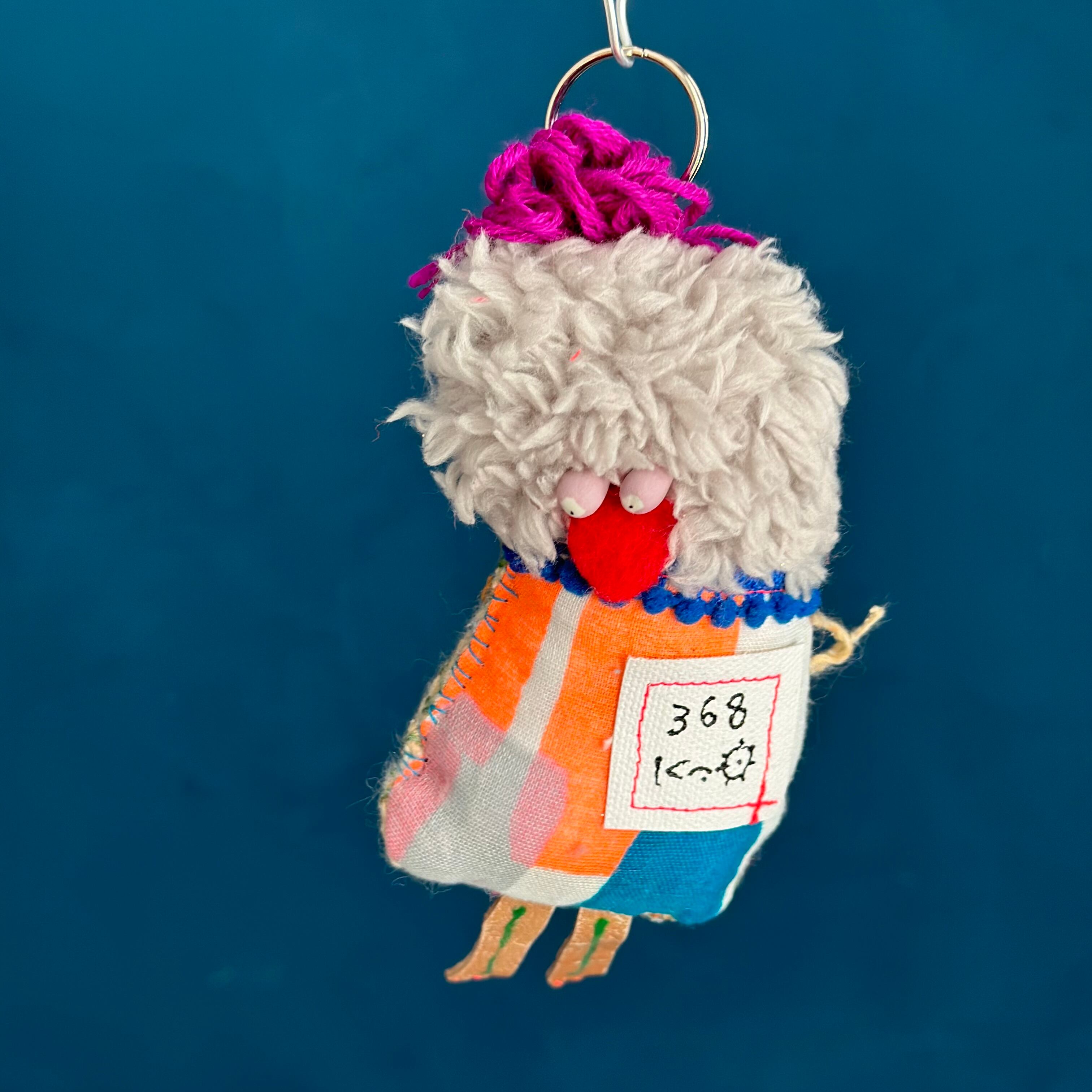 ぬいぐるみ制作が終わると、〆作品として作るハギレンジャー。作品制作時に生まれたハギレや端材と手織りされたさをり織のハギレ、古着を再利用した、小さなマスコット。目玉に使っているのは陶芸家さんに作っていただいた陶ビーズで愛嬌あるマスコットです。頭のてっぺんに二重リングをつけてあるので、キーホルダーやバッグチャームなどにも使用できます。制作した順番にシリアルNo.をつけています。