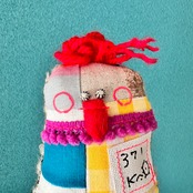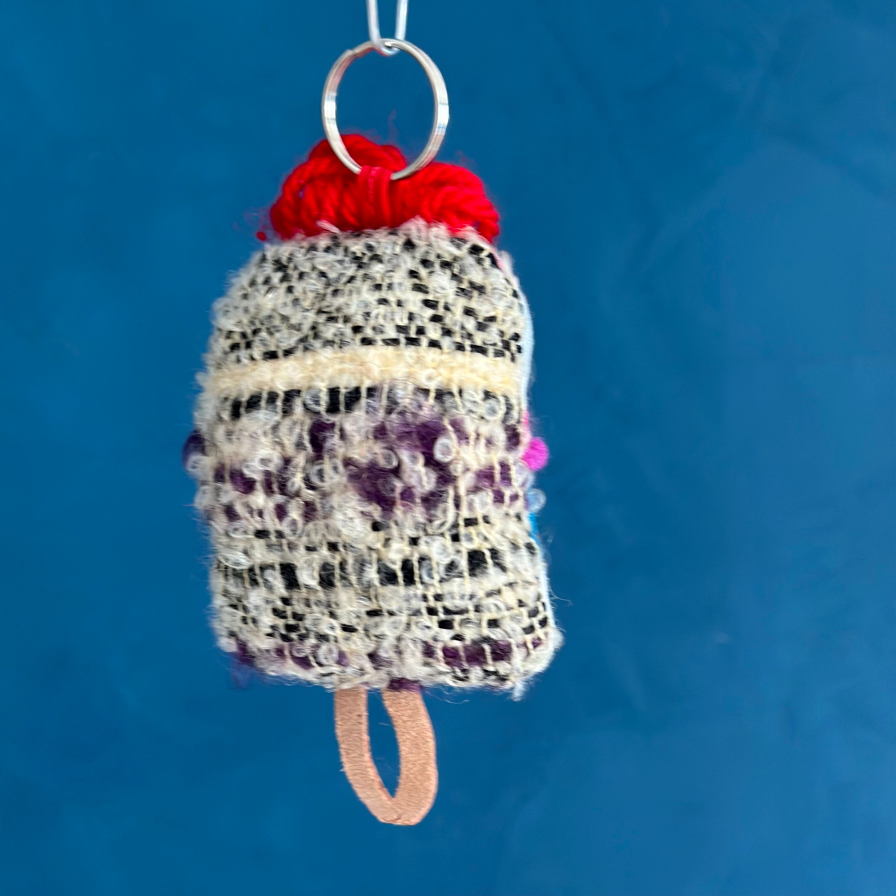 ぬいぐるみ制作が終わると、〆作品として作るハギレンジャー。作品制作時に生まれたハギレや端材と手織りされたさをり織のハギレ、古着を再利用した、小さなマスコット。目玉に使っているのは陶芸家さんに作っていただいた陶ビーズで愛嬌あるマスコットです。頭のてっぺんに二重リングをつけてあるので、キーホルダーやバッグチャームなどにも使用できます。制作した順番にシリアルNo.をつけています。