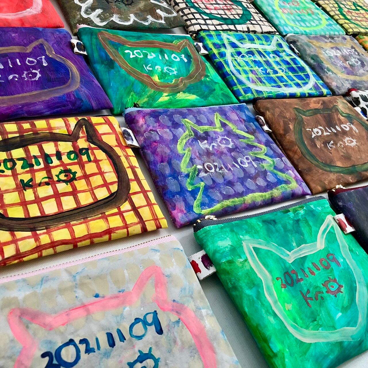 お絵描きポーチ(ファスナー14センチ)は、絵画を描くときに使用する絵の具を使って描いた原画をそのままポーチにしたものです。なので、発色が美しく、筆運びもそのまま。