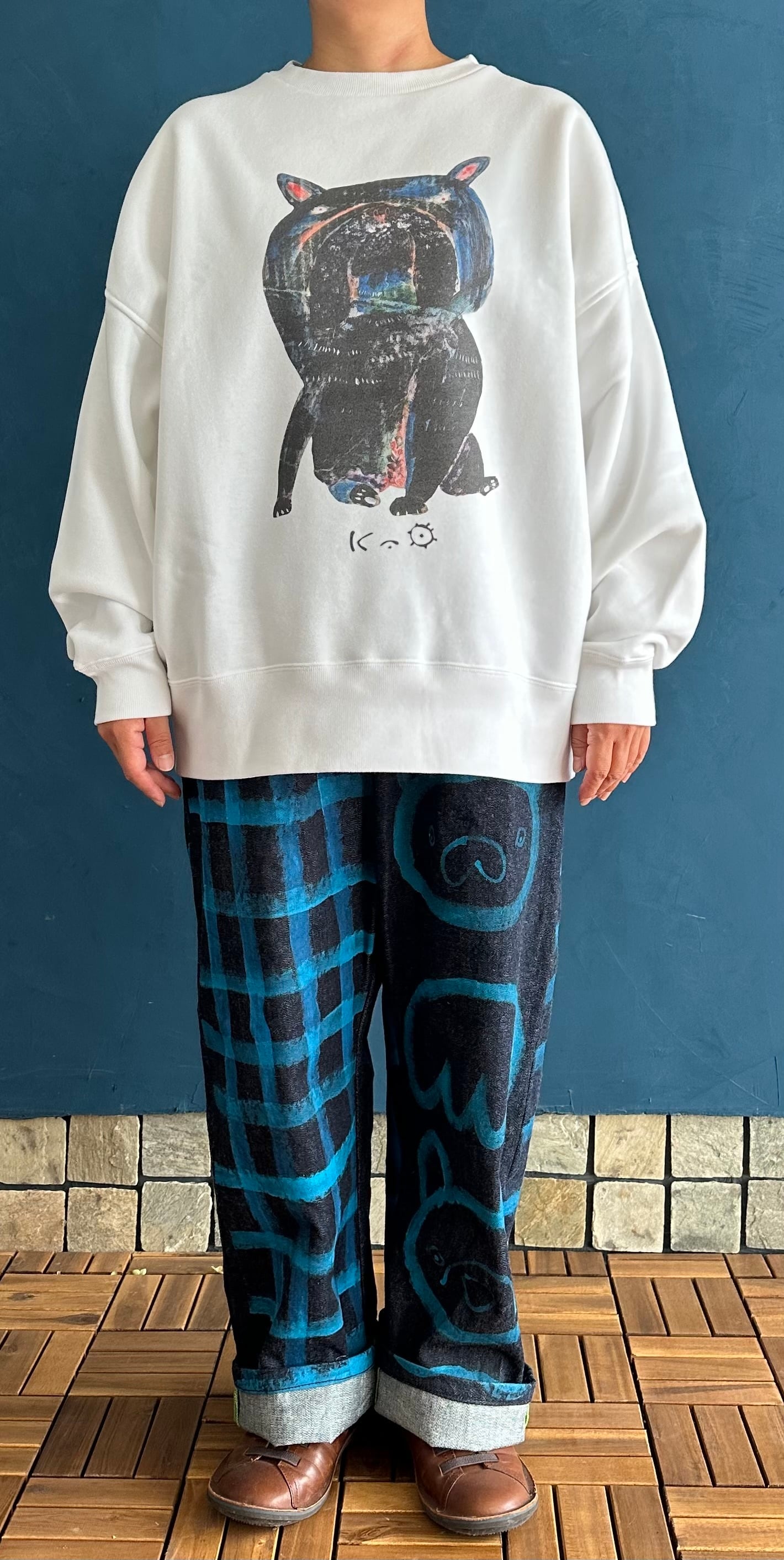 オーバーサイズの白地スウェットにいつかに描いたダンボール画のフレンチブルドッグ(ブリンドル)をプリントしました。