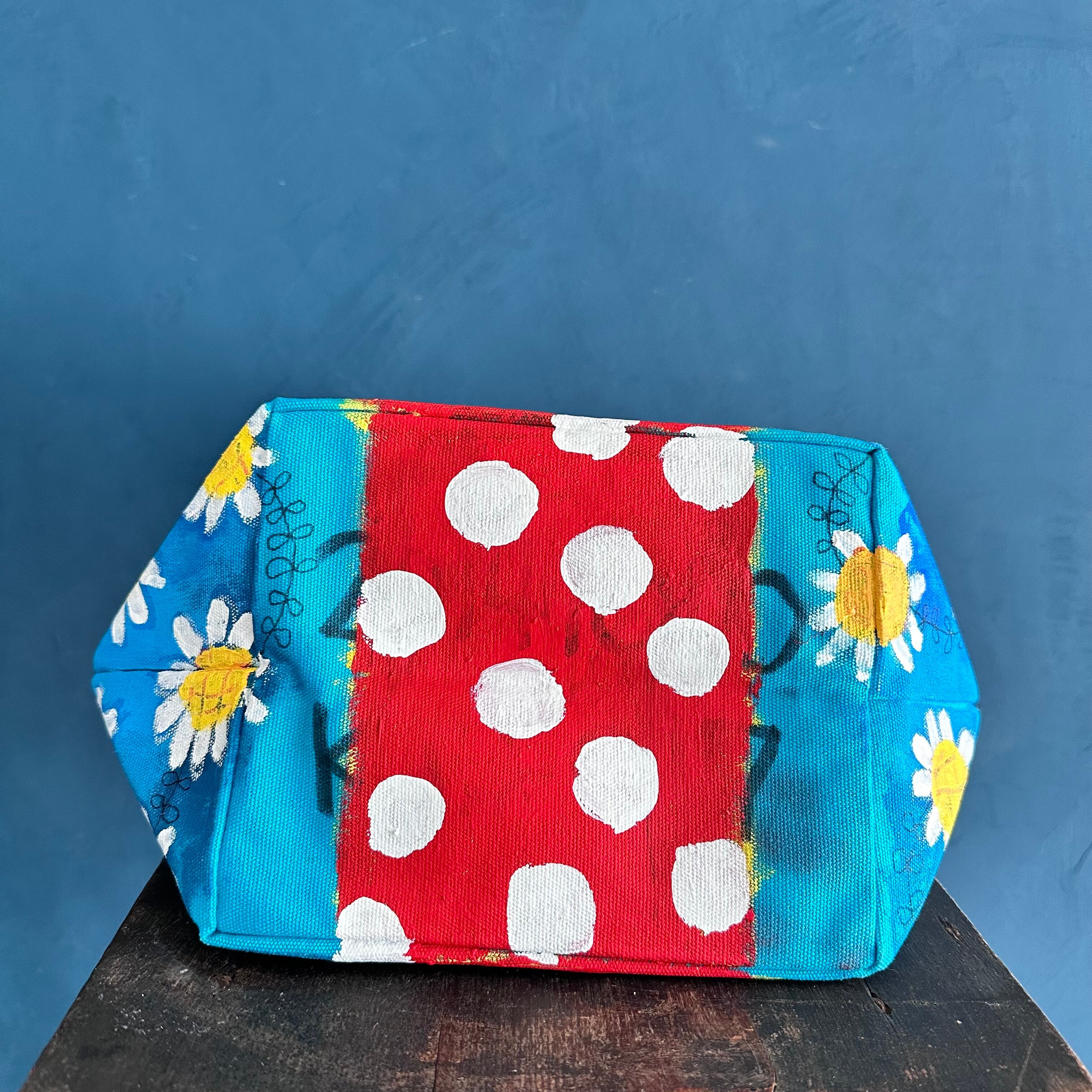 帆布の既成のトートバッグに隈なくいろんな画材を使って塗りたくった10年前ほどの作品をさらにフレブルちゃんを上描きしたアートスティックなトートバッグ!