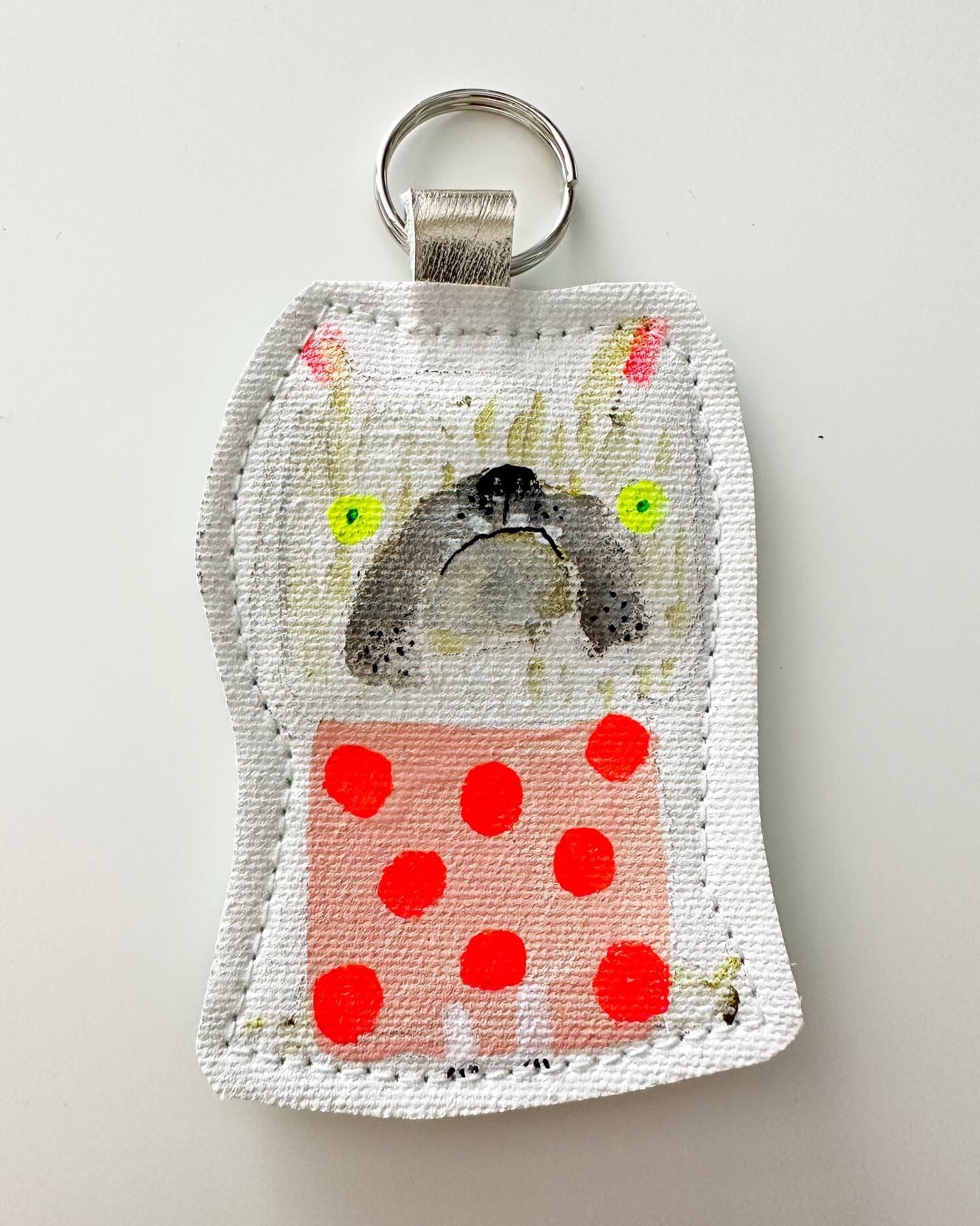 canvasの端材ができると制作するのが小さな小さな日用絵画雑貨たち。こちらはcanvas端材と革端材で作るキーホルダー。裏面は制作年月日入り